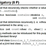 1.7에 있는 내용은 이렇다 자바의 Standard library 를 사용하지 않고 특정 원소 x가 배열 arr안에 있는지 파악해야 하고 b)에선 재귀를 통하여 ch라는 문자가 arr에 몇번 나오는지를 파악해야한다. 먼저 a)부터 시작하자면 재귀를 통하여 arr이란 배열에서 x를 계속해서 찾아내고 배열의 끝이면 리턴을 하면 된다. public static boolean contains(double x, double[] arr, int endIndex) {if ( endIndex < 0)return false;else if (x == arr[endIndex])return true;else if (x != arr[endIndex])return contains(x,arr,endIndex-1);return fa..